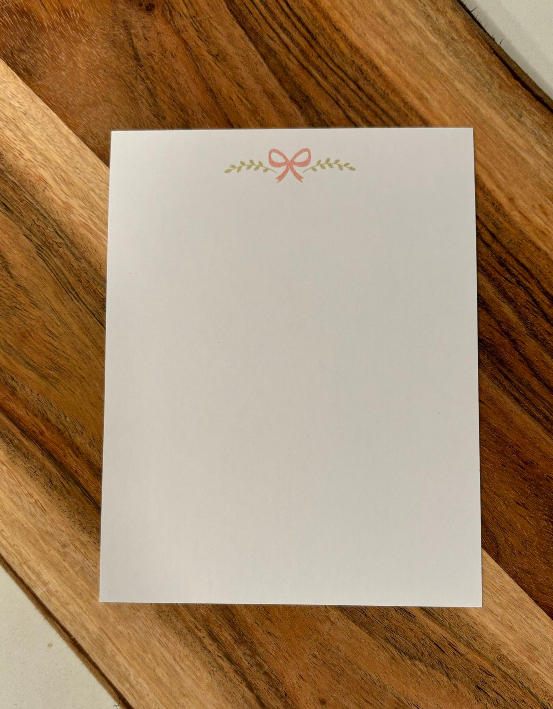 12 pink bow notecards with green vines. Comes with 12 white square flap envelopes.