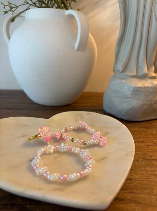 Darling pink bracelets with bows, flowers, and pearls. Comes with an adjustable pink bear lollipop ring.